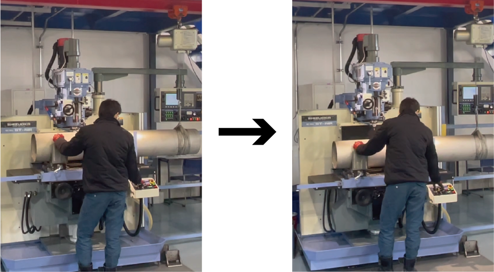 いえ。4mくらいのパイプを扱う事もあるため、パイプの両端を持つ2人とチェーンブロックを操作する人の3人で作業することもしばしばでした。ワークが上がる速度も遅く、3人を拘束する時間も長くなっていました。