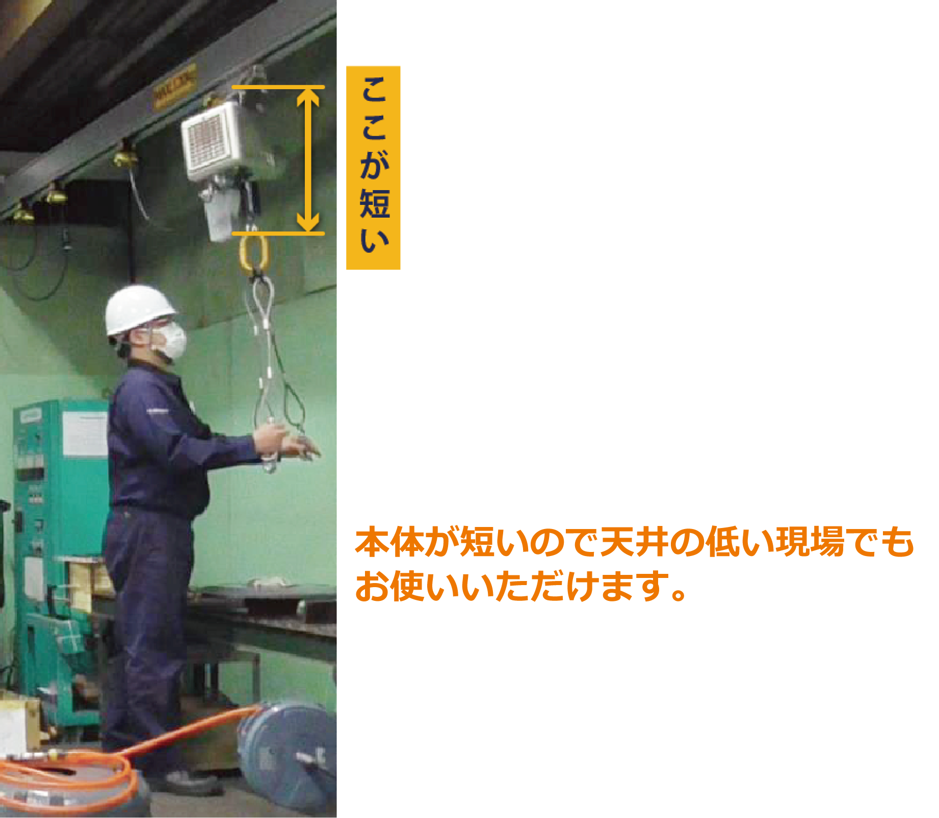 天井が低い現場だったので、一番高い位置までフックが巻き上がるムーンリフタを選定しました。