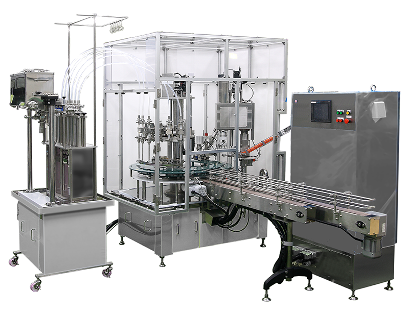 液体充填機は重量式、ピストン式、質量流量式、液面規制式など液種に合わせた検量方法をラインナップ。