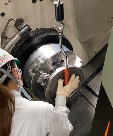 ワークを三ツ爪チャックにセットする際、加工精度に影響が出ないようにワークをピタッと合わせてチャッキングします。