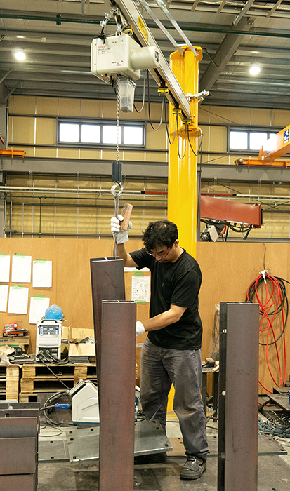 ジブクレーンも含めて提案をいただき、作業範囲も申し分ないこと、また操作性や安全性も良く、天井クレーンの邪魔にならずに設置できる点が決め手でした。