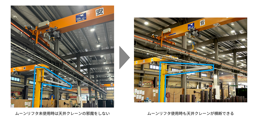 そのため天井クレーンの邪魔をしない形で設置できる装置がないか探していました。