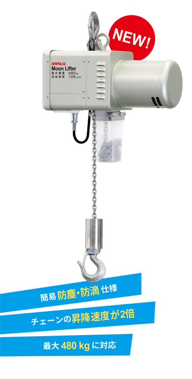 チェーンや下フックまわりをステンレス製に変更、最大重量を変更、揚程4 m 以上に変更、電源ケーブルの延長をご希望の場合は弊社営業までお問い合わせください。