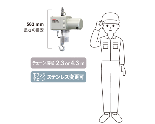 チェーンや下フックまわりをステンレス製に変更、揚程4 m 以上に変更、電源ケーブルの延長をご希望の場合は弊社営業までお問い合わせください。
