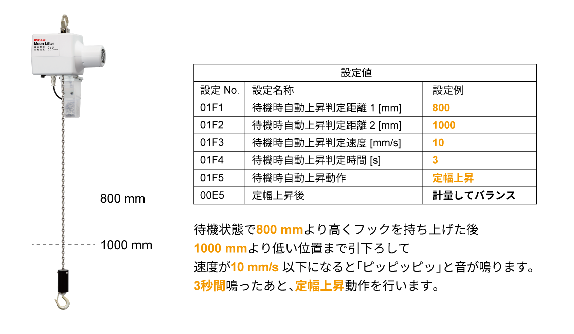 高さ、速度、時間の3つの条件を満たせば、ボタン操作無しで、ワークが自動で上昇後ムーンリフタが計量してアシストを開始します。