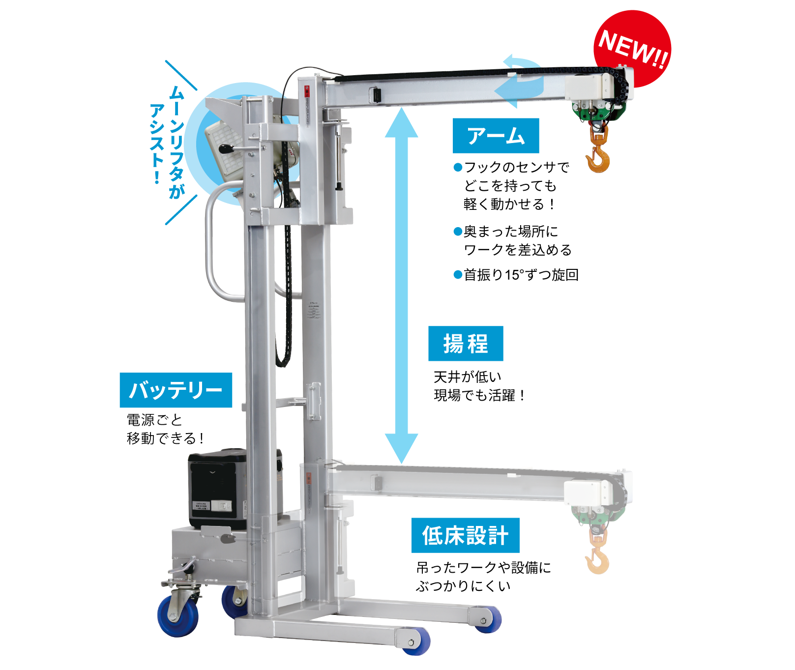 天井が低い、複数の場所で使いたい、レールやクレーンは設置できない、奥まった場所にワークを差し込みたい、そんなご要望にお応えします!80 kgタイプ、120 kgタイプをラインアップ